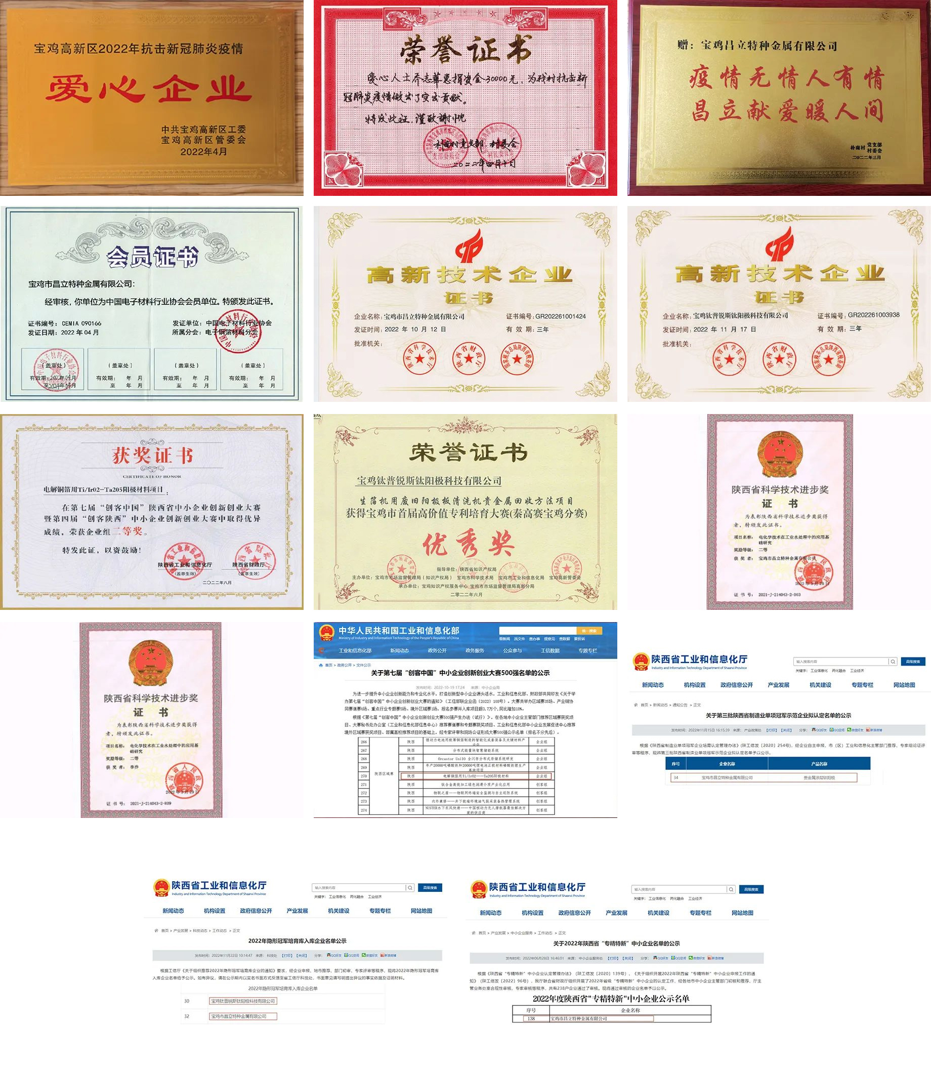 歲月不居,天道酬勤。回顧2022年,公司創(chuàng)造了可喜可賀的成績。在疫情期間承擔(dān)社會責(zé)任,助力一線抗疫。昌立公司被認(rèn)定為陜西省“專精特新”中小企業(yè);《電化學(xué)技術(shù)在工業(yè)水處理中的應(yīng)用基礎(chǔ)研究》項目獲“省科學(xué)技術(shù)進(jìn)步獎”二等獎;入選第三批陜西省制造業(yè)單項冠軍示范企業(yè);入選2022年陜西隱形冠軍培育庫。鈦普銳斯被認(rèn)定為“國家高新技術(shù)企業(yè)”;2022年陜西省秦創(chuàng)原高價值專利大賽分賽區(qū)-“寶雞高價值專利培育大賽優(yōu)秀獎”;第四屆“創(chuàng)客陜西”中小企業(yè)創(chuàng)新創(chuàng)業(yè)大賽省級決賽獲大賽企業(yè)組二等獎;入圍第七屆“創(chuàng)客中國”中小企業(yè)創(chuàng)新創(chuàng)業(yè)大賽500強;入選2022年陜西隱形冠軍培育庫。